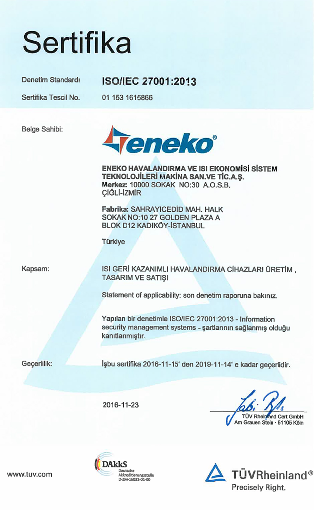 ENEKO A.Ş., Ağustos 2016 tarihinde ISO 27001:2013 Bilgi Güvenliği Yönetim Sistemi Standardı’na göre denetlenmiş, Eneko ile paylaştığımız tüm bilginin gizlilik, bütünlük ve erişilebilirliğini başarı ile sağlayarak “ISO 27001 Bilgi Güvenliği Yönetim Sistemi” belgesini almaya hak kazanmıştır.
