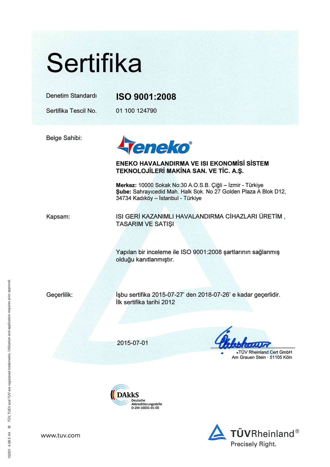 2015 yılında Kalite Yönetim Sistemi ile ilgili yapılan çalışmalardan bir tanesi olan 2012 yılından bu yana TÜV Rheinland denetimleri ile sürdürmekte olduğumuz, üretim ve hizmetler için almış olduğumuz ISO 9001:2008 sertifikasyonumuz Haziran ayı içerisinde yapılan TÜV Rheinland denetimleri ile yenilenmiştir.
