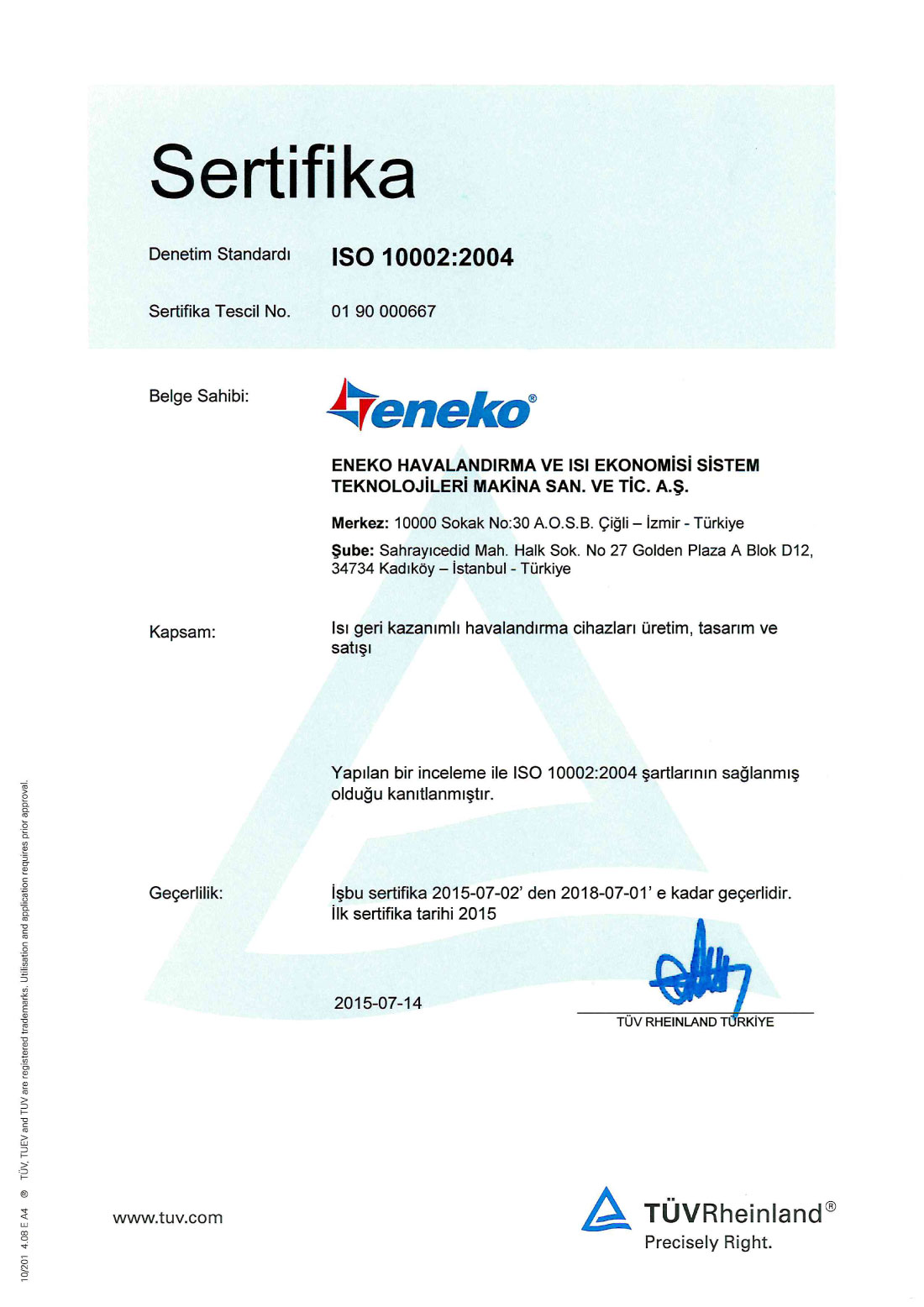 Bu yıl müşterilerimizin memnuniyetlerini artırma yolunda kurumsallaştırdığımız çalışmaların yine TÜV Rheinland tarafından denetlenmesi ile ISO 10002:2004 “Müşteri Şikayetleri Yönetimi Standardı” sertifikasını da almış bulunuyoruz. Ürünlerimizde olduğu kadar diğer hizmetlerimizin kalitesinde de en üst seviyeyi kurumsal bir yapıda sürekli ve sürdürülebilir olarak devam ettirmek de politikalarımızdandır.