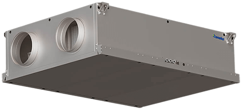 2400 m3/h’ye kadar hava akışına sahip 6 farklı boyut seçeneği, iç mekanda kuruluma uygun, kompakt, çift cidarlı, tavan tipi tasarım